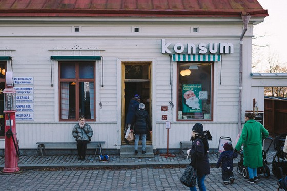 The exterior of the Co-op Store is modelled on a shop in Hudiksvall. The façade is clad in white horizontal panels, and the roof is painted red.