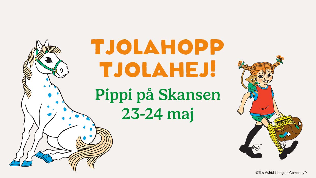Pippi är tillbaka på Skansen! Den 23–24 maj 2026 fylls parken av lek, musik och härlig Tjolahopp tjolahej-stämning för hela familjen. Upplev en färgsprakande sångteater på Sollidenscenen och ta del av musik, torghandel och roliga aktiviteter med inspiration från Pippi och andra älskade karaktärer ur Astrid Lindgrens böcker.